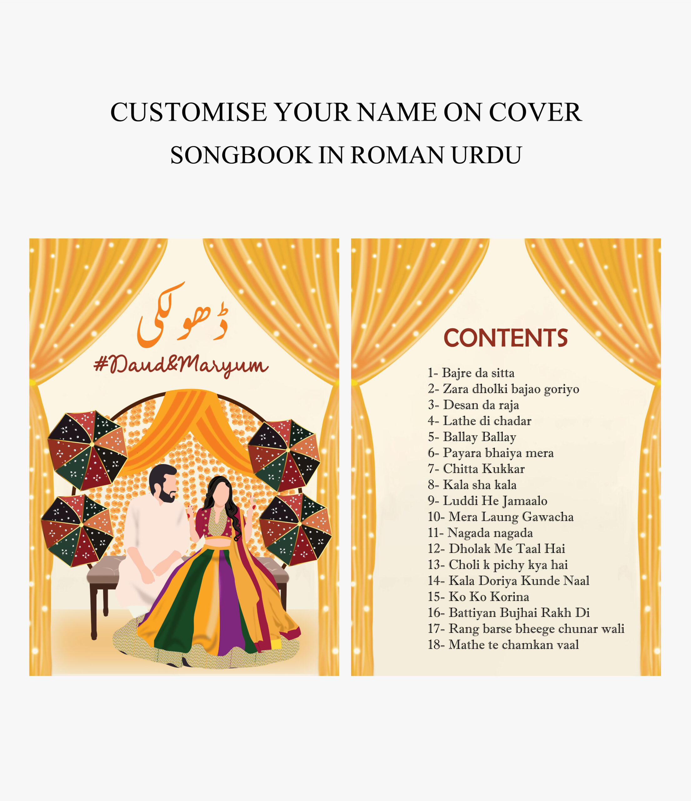 This comprehensive 18 songs book is perfect for Dholki, Mehndi Night, & Sangeet.