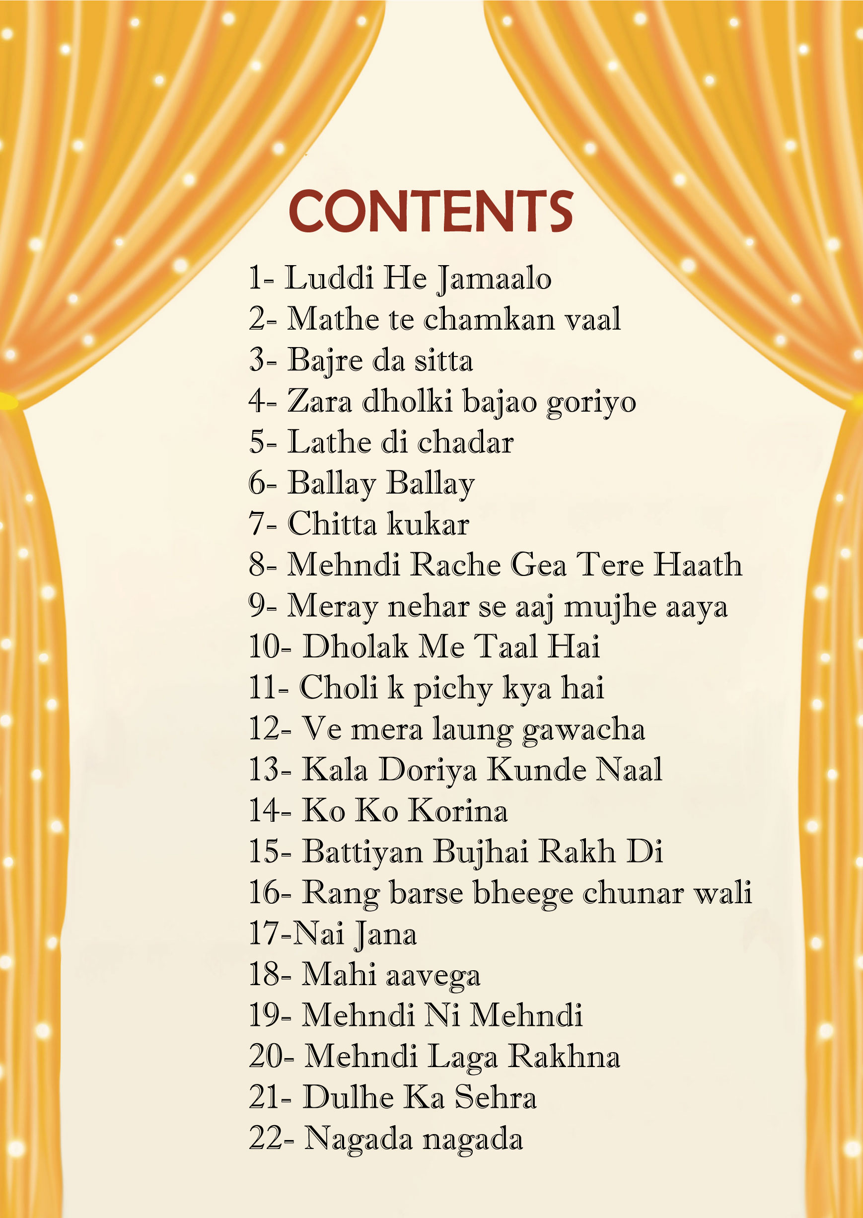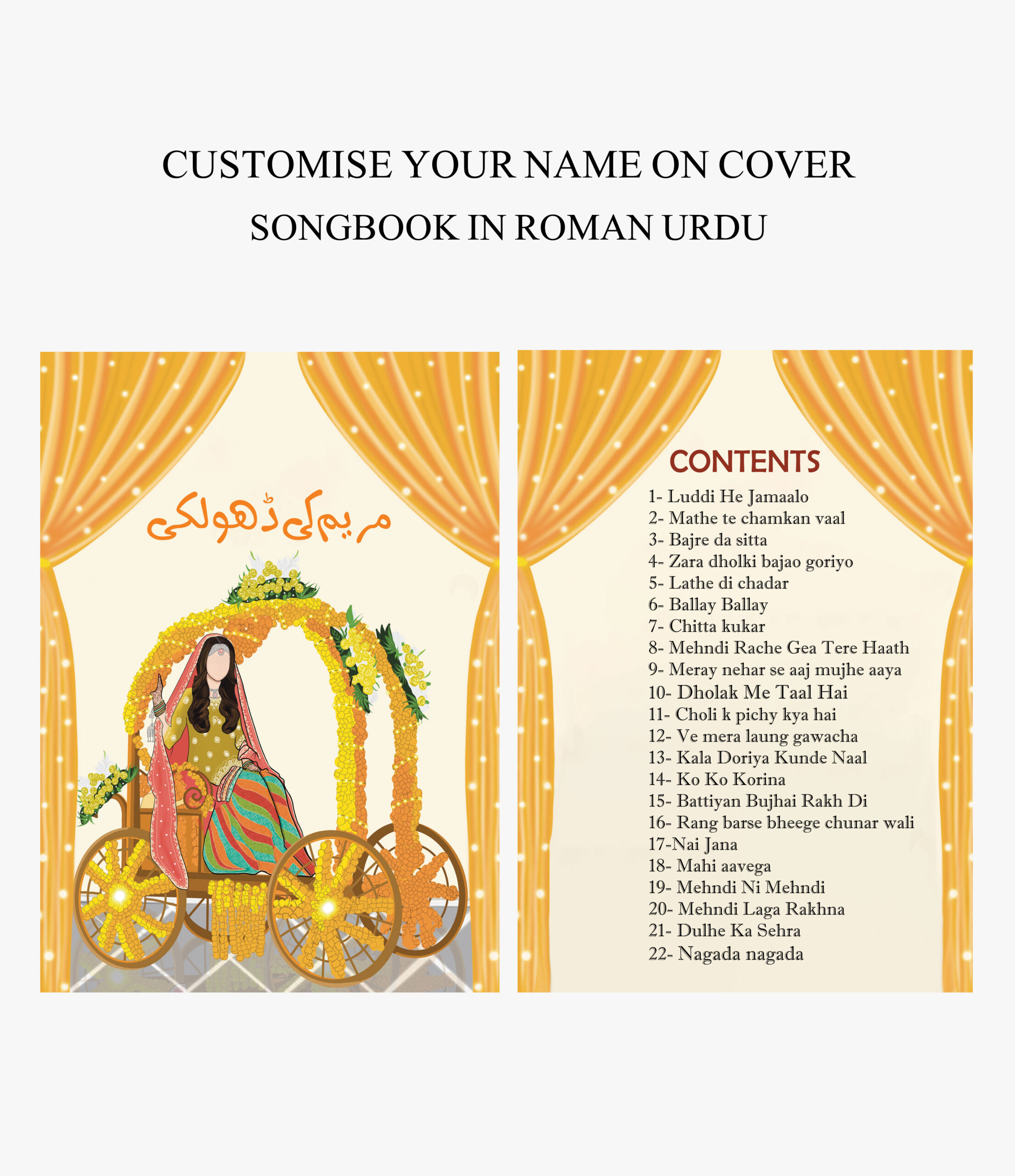– 22 Songs in Urdu/Roman: This songs book includes 22 popular Dholki songs in Urdu/Roman.