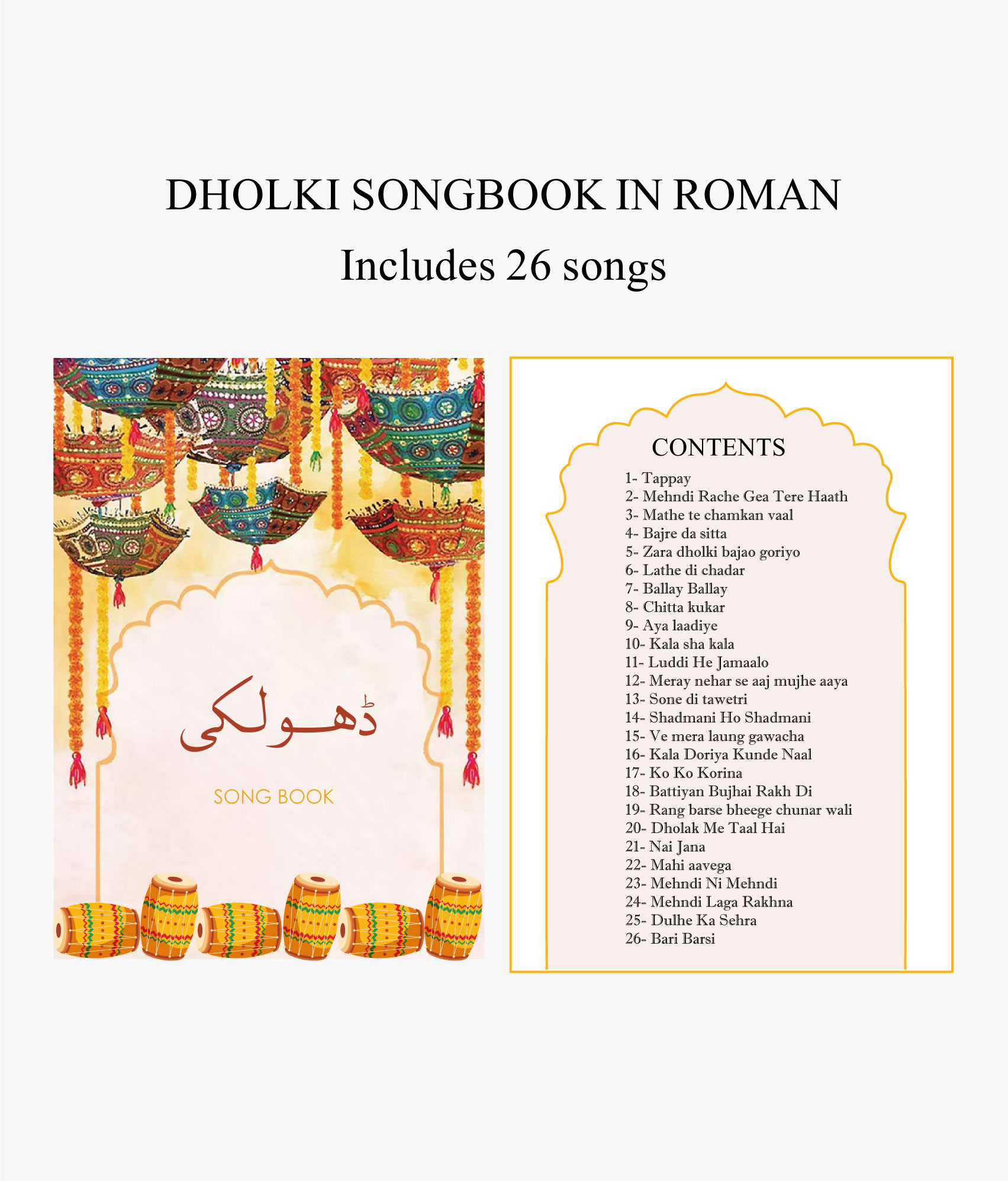 – 26 Songs in Urdu or Roman: This songs book includes 26 popular Dholki songs in Urdu or Roman.