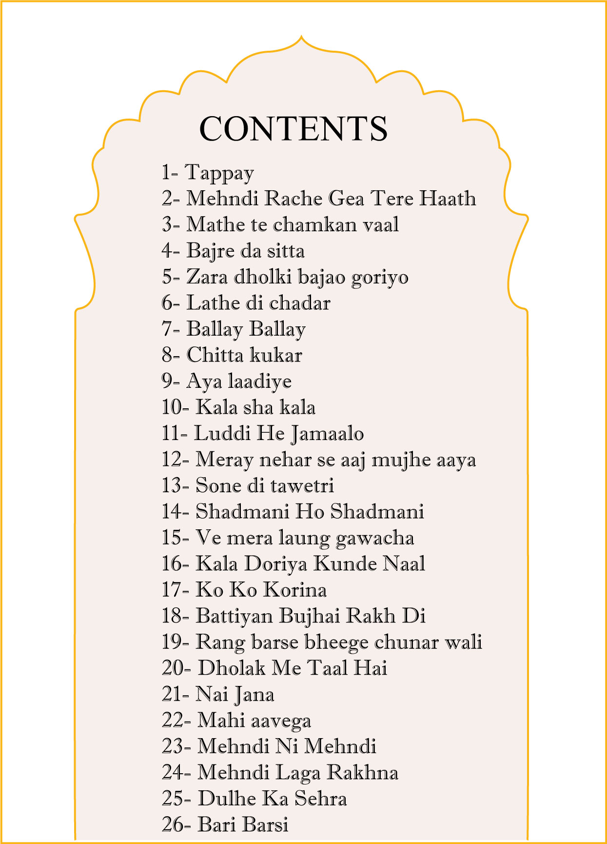 This comprehensive 26 songs book is perfect for Dholki, Mehndi Night, & Sangeet.